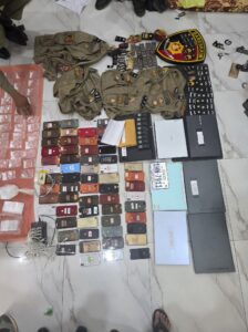លោកបានបន្តទៀតថាបានដកហូតវត្ថុតាង: ទូរស័ព្ទដៃ៥៩គ្រឿង ឧបករណ៍ថតសម្លេង៨គ្រឿង កុំព្យូទ័រឡេបថប៧គ្រឿង ឯកសណ្ឋាននគរបាលឥណ្ឌូនេស៊ី៤អាវ សក្តិ និងឡូហ្គោមួយចំនួន ។